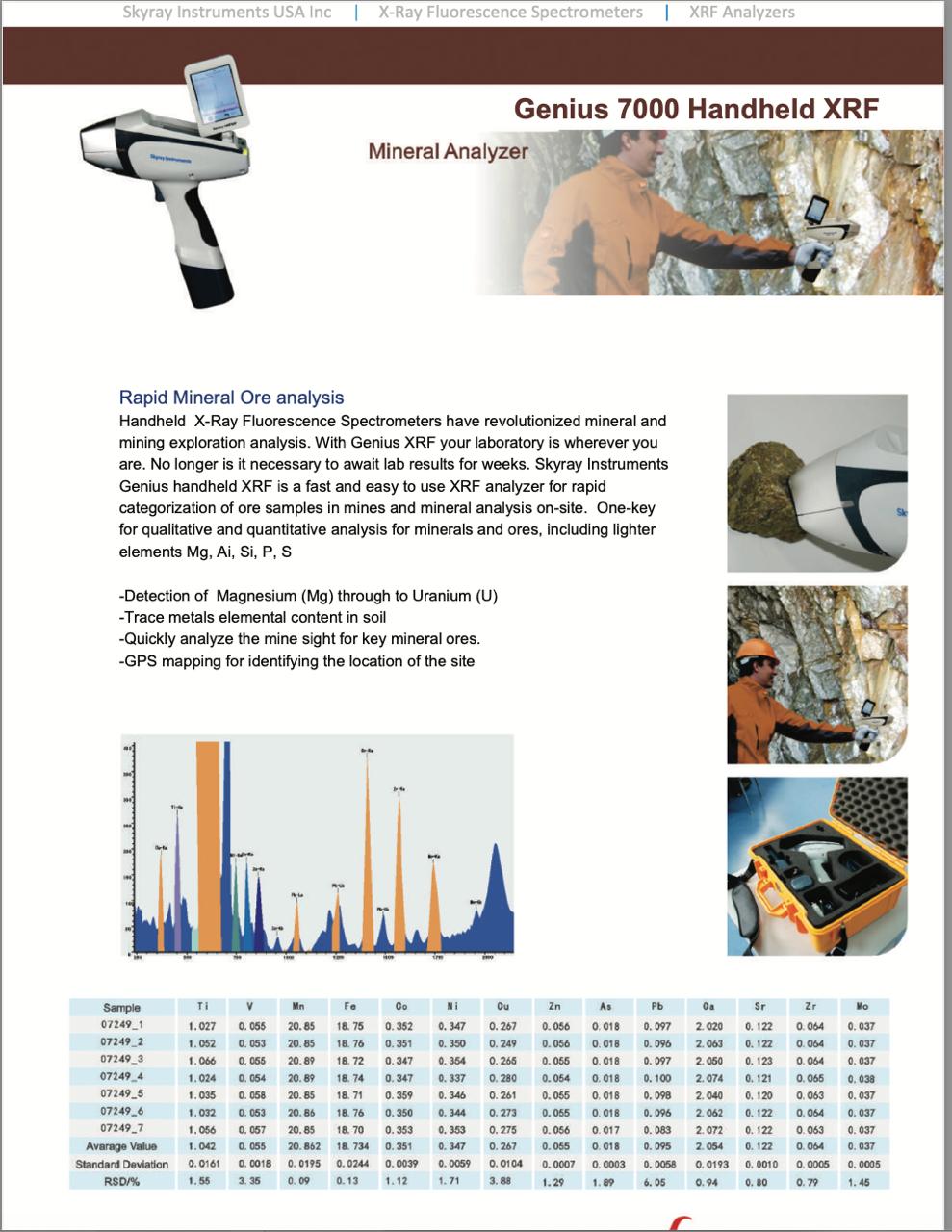 Genius XRF portátil es un analizador XRF rápido y fácil de usar para la categorización rápida de muestras de mineral en minas y el análisis de minerales en el sitio. Una tecla para el análisis cuantitativo y cualitativo de minerales y menas, incluidos los elementos más livianos Mg, Ai, Si, P, S